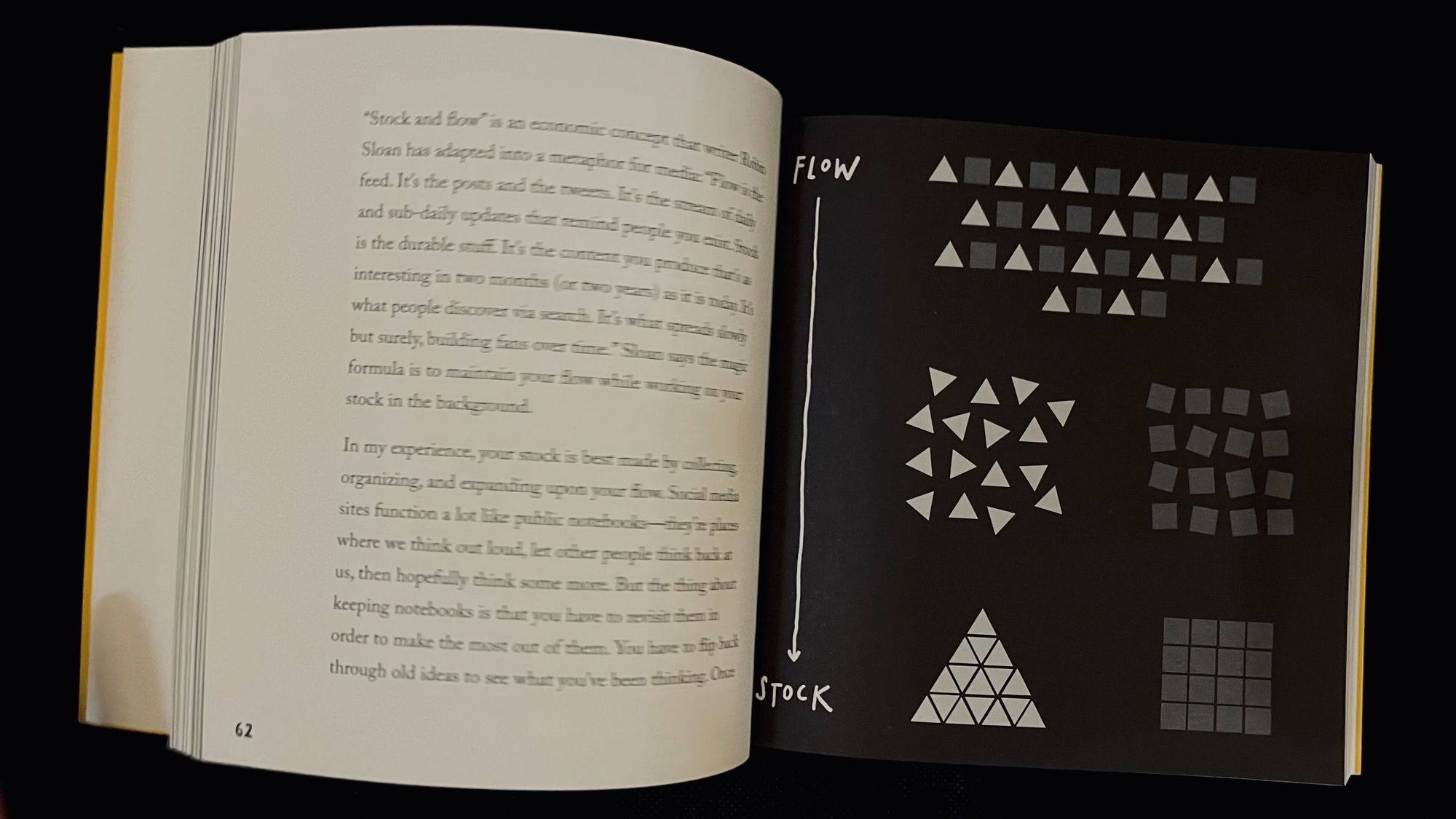 第二点就书中提到的“Stock and Flow”的概念了,这个概念虽然书中只用了两页的文字和一张图来表达,但却是我对全书两个最深刻的启示的其中一个。这个概念很简单,Flow就是关于我们每日的生活进展,我们的日常思考和一些更新,是我们发的帖子和动态或者blog。Stock就是指一些更加恒久的东西,是一些就算经过长时间之后也依然让人感兴趣的事物和内容,是一些经过研究和总结之后得出来的东西。Flow其实是Stock的前身,或者说是原材料。我们每个人几乎每天都会有新的Flow出现,但不是所有人都会把他们记录下来,而其实如果我们想要创造属于自己的Stock,那么我们首先就必须要把我们的Flow不断记录下来,记录的方式有很多种,比如写下来,录音录下来,通过分享动态或者blog记录等等。其实什么方式都好,最最重要的有记录,因为只有对我们的Flow做了记录,我们才能进行回顾,我们通过回顾就很可能会发现这些Flow之间的某种规律和关系,找到这些联系之后,我们就可以慢慢将它们一片一片逐点地组织起来成为一些更加恒久的东西,而这些就是我们的Stock。相反,如果我们不做记录,我们其实就没有办法回顾,我们的Flow就如同Instagram story一样,不时地出现然后消失,然后我们几乎不会再重新想起来了。其实我们很多重要的想法和灵感都源于日常,这些可能会影响我们一生的瞬间产物,我们为什么要轻易地让它飘走变成虚无呢?这个概念让我不再纠结于自己以后会写一本什么样的书,因为我通过分享blog来记录我的Flow,相信在某天某日,我会找到规律然后创造出属于我自己的Stock。在此本人又要感慨一下了,阅读真是使人心定,又更加相信自己可以坚持分享了。